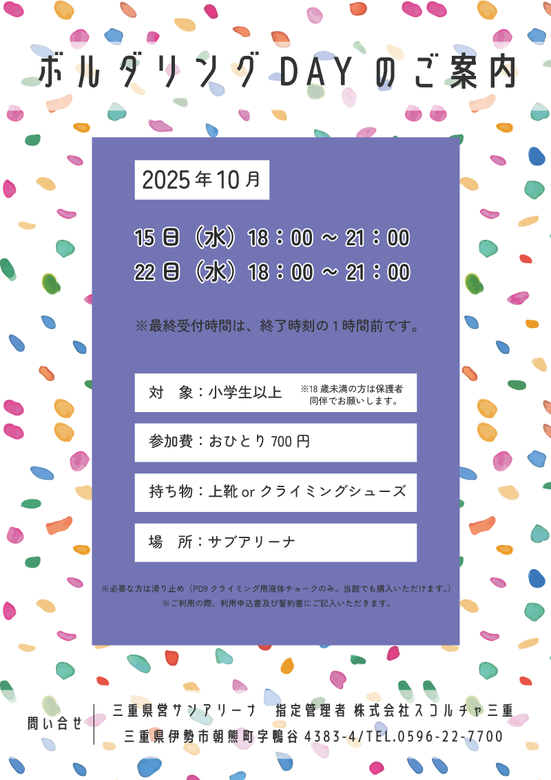 『ボルダリングDAY』10月の開催日につきまして、下記のとおりお知らせいたします。