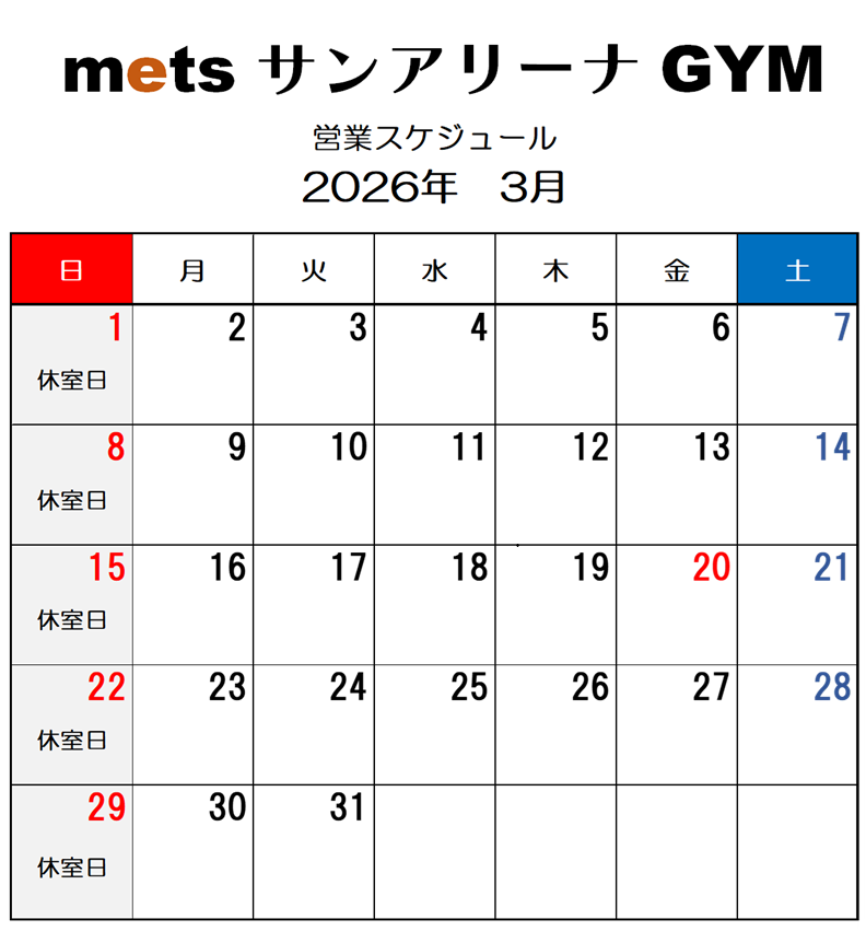 2026年3月 mets サンアリーナ GYM休室日