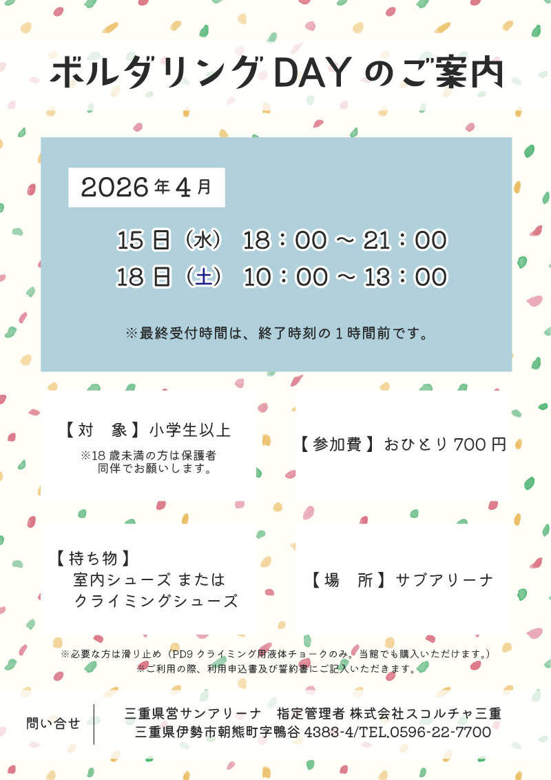 4月『ボルダリングDAY』の開催日につきまして、下記のとおりお知らせいたします。